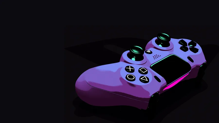 Sleek Purple Ps5 Controller With Illuminated Buttons And Ergonomic Design Perfect For Immersive Gaming Sessions In Low Light Environments.