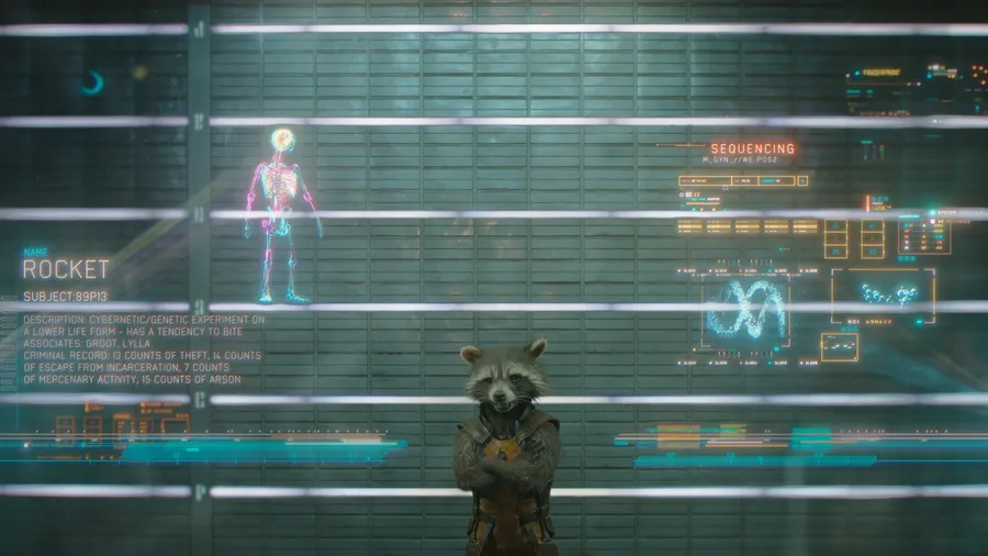 Rocket Raccoon Examines Advanced Holographic Data Displayed On A Futuristic Screen In A High Tech Environment