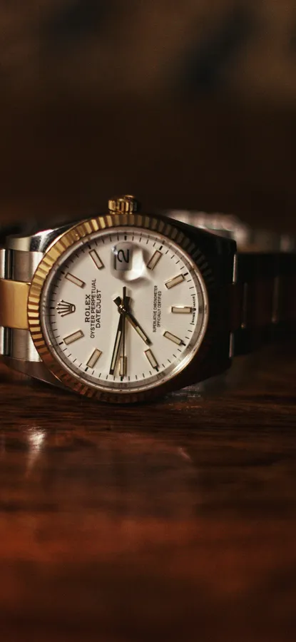 Detailed Closeup Of A Rolex Datejust Watch Showcasing Its Classic Design And Craftsmanship On A Wooden Surface.
