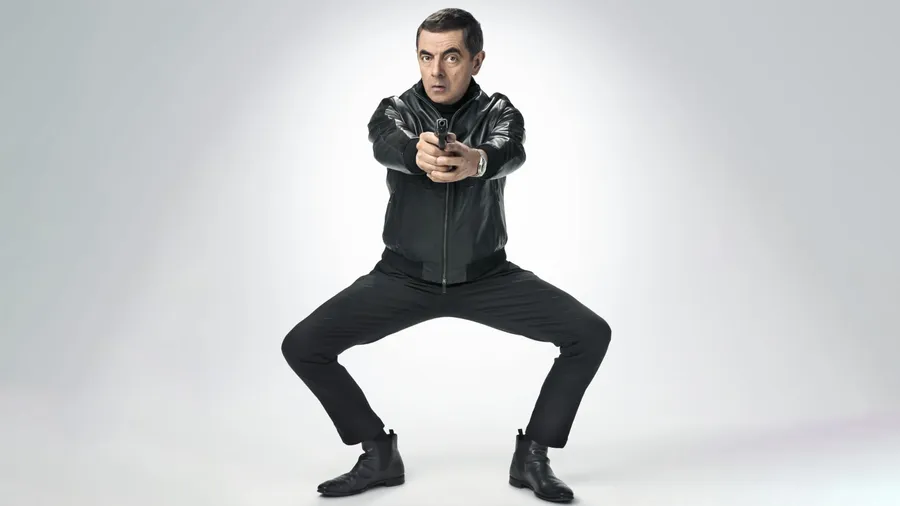 A Man In A Black Leather Jacket And Trousers Stands In A Wide Stance, Pointing A Gun Directly At The Camera Against A Light Background.