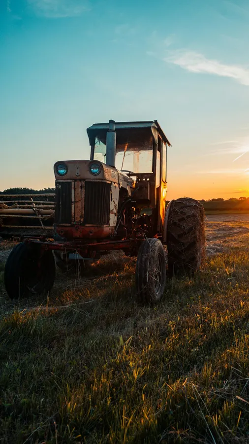 Vintage Tractor Parked On A Country Farm Field During A Golden Sunset, Highlighting Rural Farming Life And Agricultural Heritage.