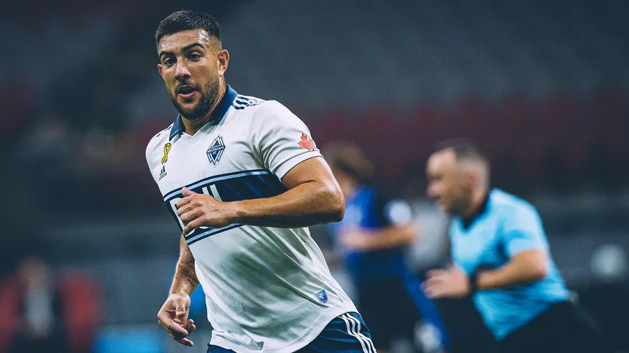 A Focused Soccer Player In A White And Blue Kit Is Captured Mid-stride On The Pitch, With A Blurred Coach In The Background.