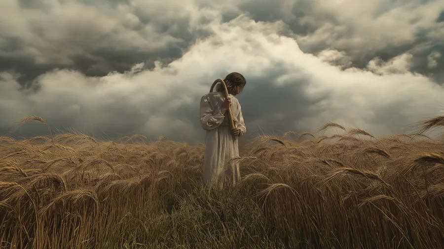 Wheat,field,figure,solitary,staff,clouds,moody,spiritual,landscape,nature,mystery,journey,contemplation,epic,bible