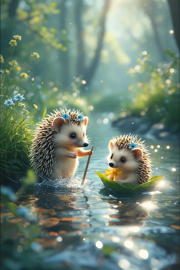 Baby Hedgehogs,animated,cute,stream,sparkling Water,blue Flower Crown,yellow Ribbon,leaf Boat,ripples,stick,gentle Green,blue,soft Sunlight,trees