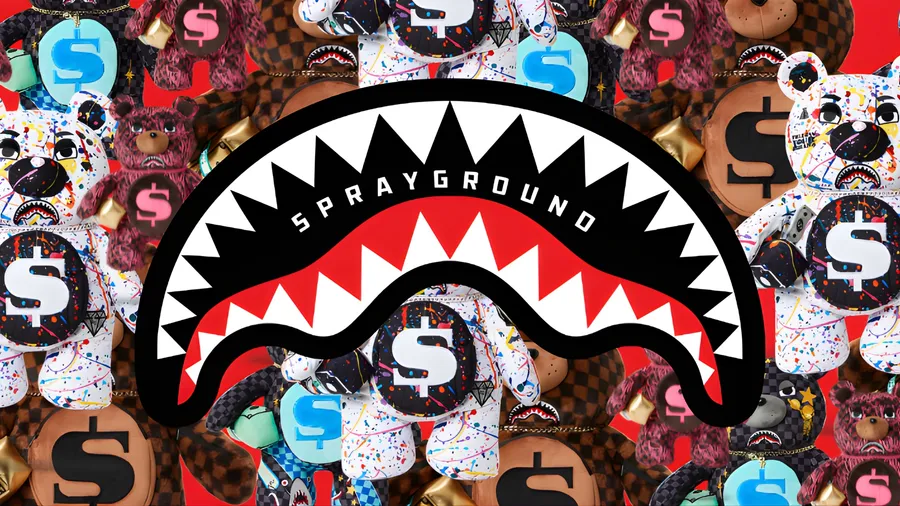 Iconic Sprayground Shark Mouth Logo With Bold Teeth And Vibrant Background Featuring Dollar Signs And Colorful Patterns Representing Urban Streetwear Style.