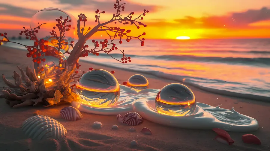 Beach,sunset,glass Orb,seashells,ocean,sand,reflection