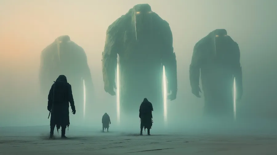Surreal,giants,fog,mystery,encounter,fantasy,dramatic,atmosphere,glowing,monumental,ancient,strangeness,dreamlike,eerie,epic