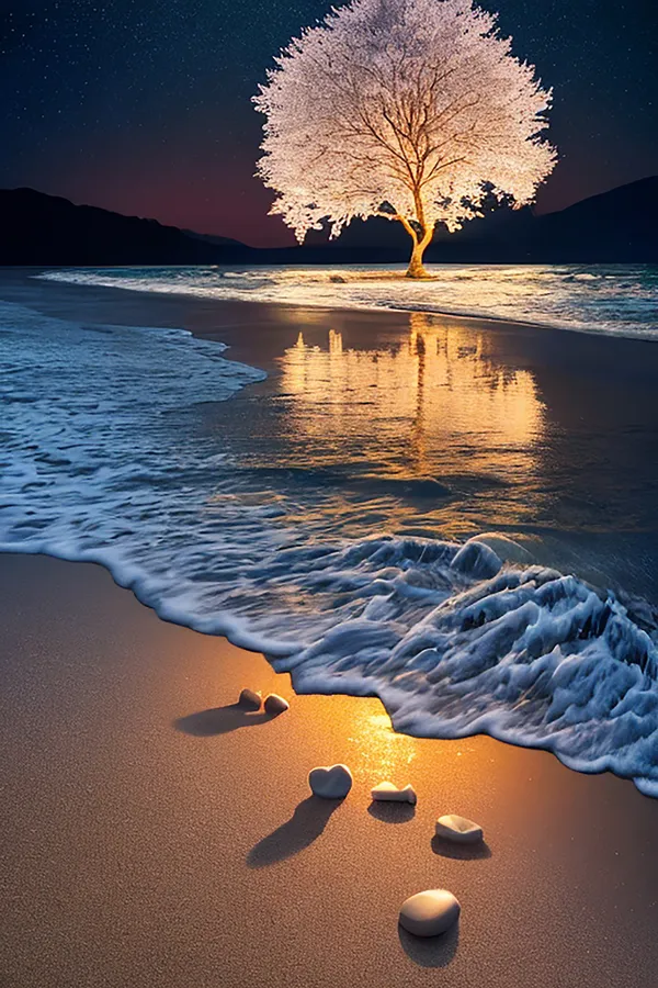 Beach,stones,night,moonlight,landscape,nature,glitter,reflection,puddle,sand,waves,coolness,silence,melancholy,naturalness
