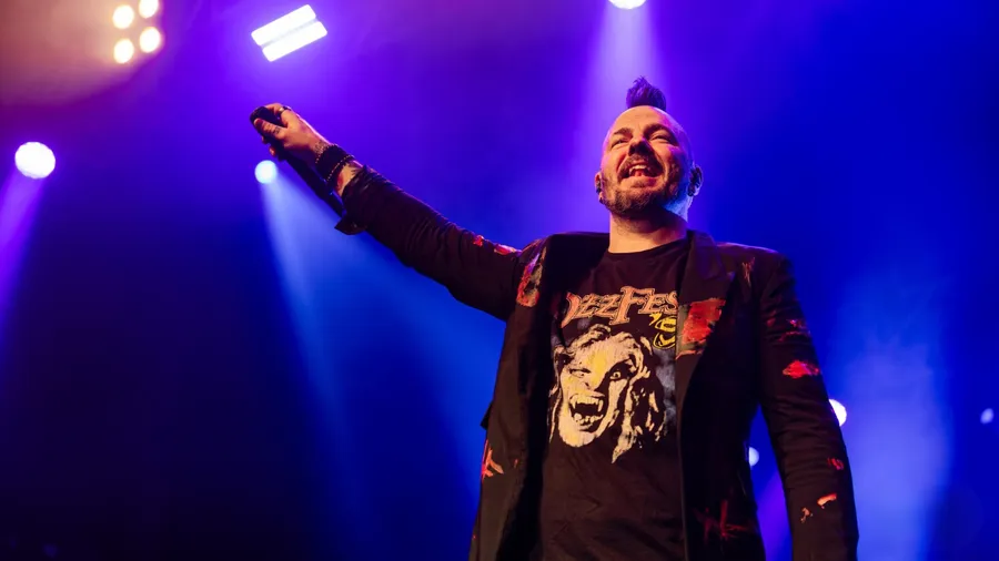 Energetic Lead Singer Engaging The Crowd During A Dynamic Rock Concert With Vibrant Stage Lighting And Passionate Atmosphere.