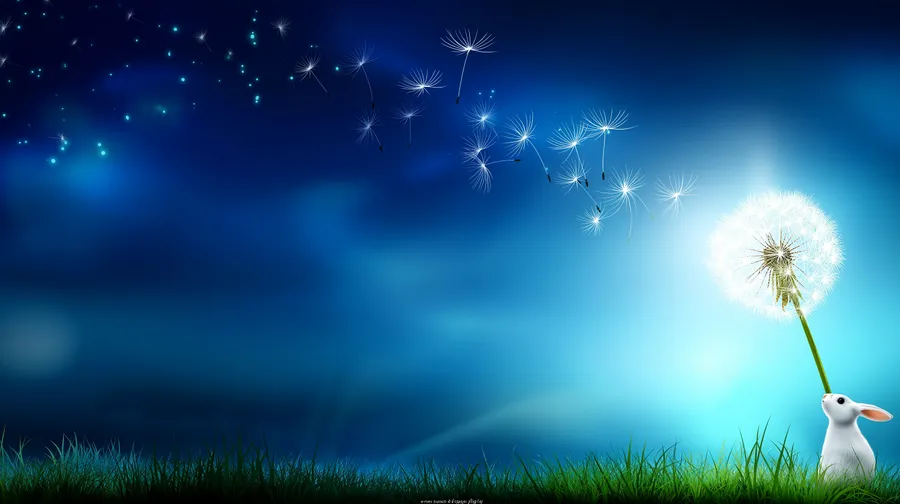 Rabbit,dandelion,seeds,fantasy,nature,illustration,dreamy,magical,whimsical,glowing,serene,imagination,wish,growth,light