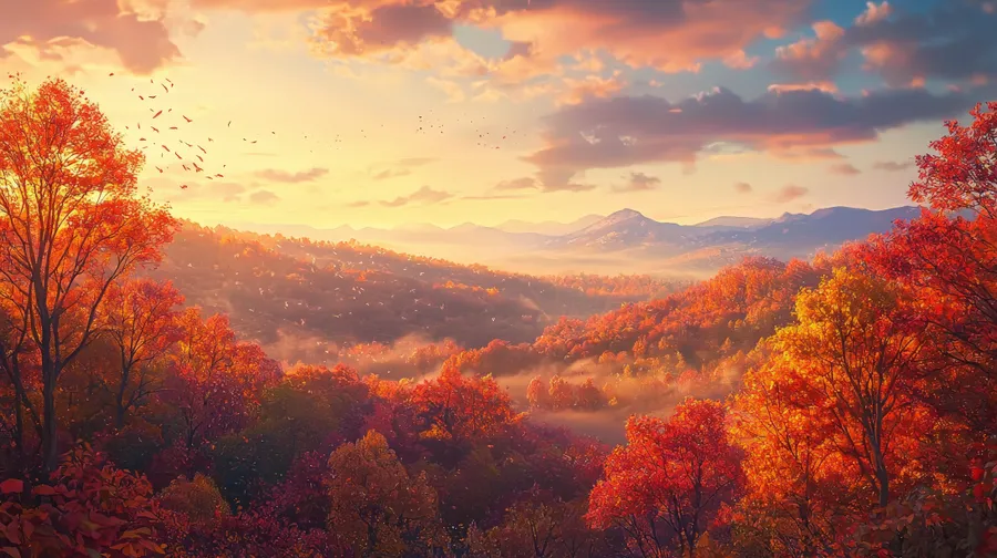 Autumn,fall,landscape,trees,foliage,colorful,nature,mountains,mist,scenic,forest,sunrise,sunset,golden,peaceful,outdoors,season,warm,vibrant,leaves
