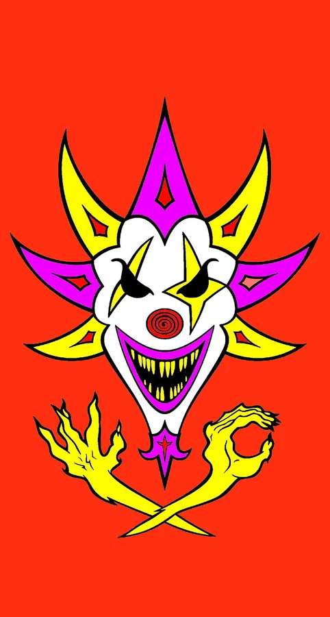 A Stylized Graphic Of A Clown Face With Exaggerated Features, Including A Swirling Red Nose, Against A Red Background, Flanked By Two Yellow Hands.