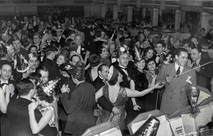 A Black And White Photo Of A Lively New Year's Eve Party With Guests In Party Hats, Dancing And Enjoying The Festivities.