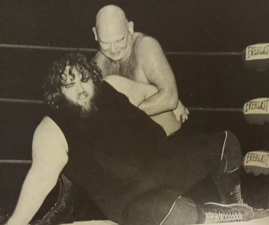 Two Wrestlers In A Ring, One With A Headlock On The Other, Both Showing Exertion, Surrounded By Ropes With The Everlast Brand Visible.