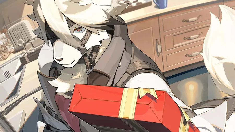Von Lycaon Excitedly Opens A Red Gift Box In A Cozy Kitchen Setting, Showcasing A Playful And Warm Moment.