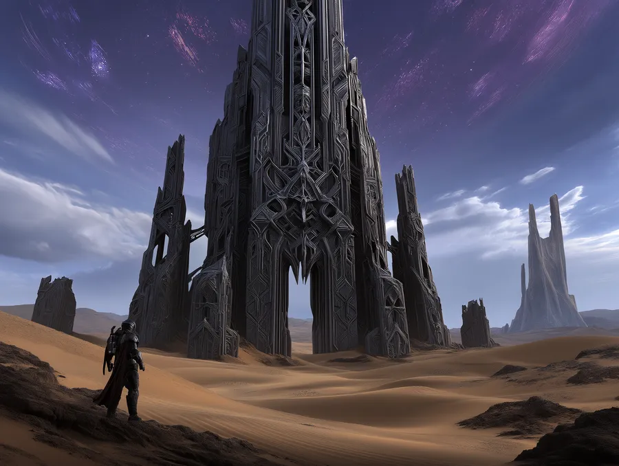 Fantasy,warrior,desert,gothic,alien,architecture,sci-fi,exploration,ancient,mystery,landscape,futuristic,dark,structure,epic