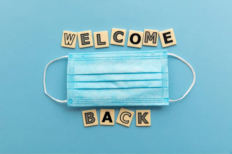 A Blue Surgical Mask With Letter Tiles Spelling "welcome Back" On A Blue Background.