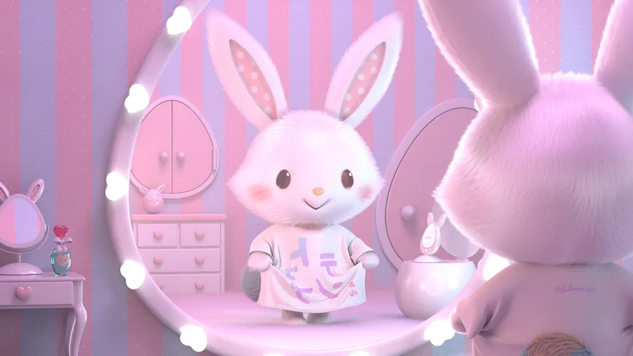 Cute Wish Me Mell Bunny Character Looking Into A Lighted Vanity Mirror In A Pastel Pink Room With Soft Lighting And Cozy Decor.