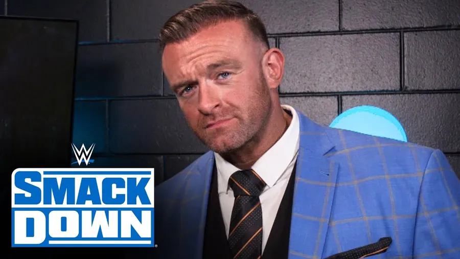 A Man In A Blue Plaid Suit Stands Backstage With A Wwe Smackdown Logo In The Foreground, Giving A Confident Look.
